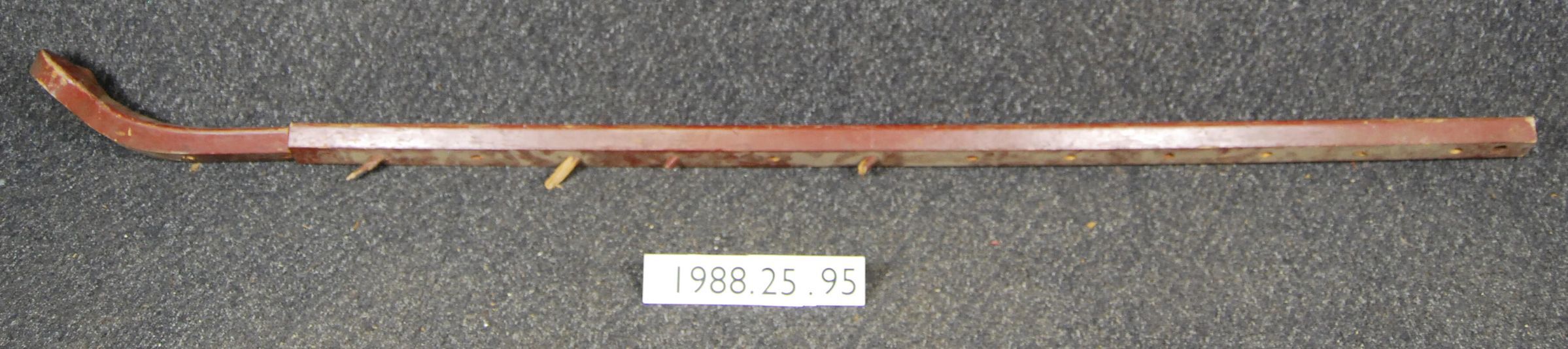 Stair handrail. Compound molding profile. End with newel post cap. Made of hardwood - possibly maple. Originally varnished, now painted red-brownish.