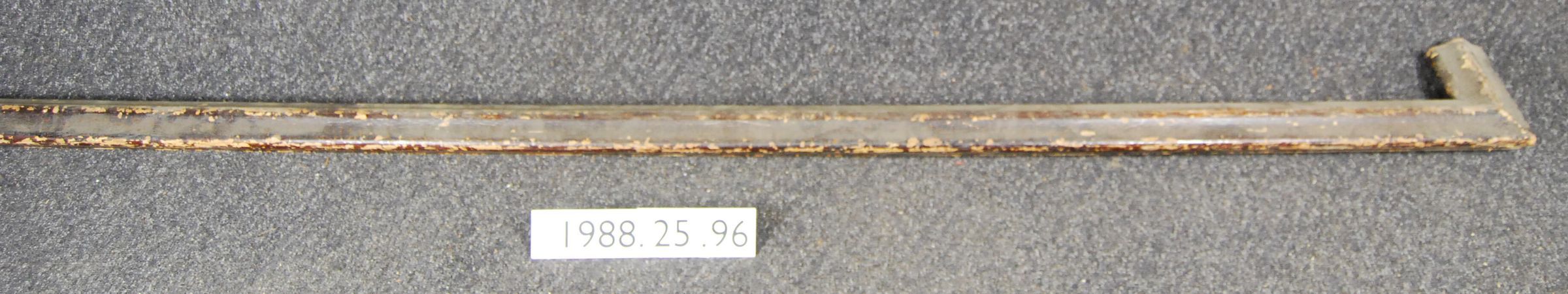 Stair handrail. Compound molding profile. Has right angle appendage at one end. Made of ash wood. Varnished.