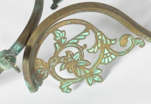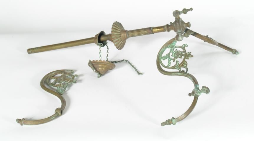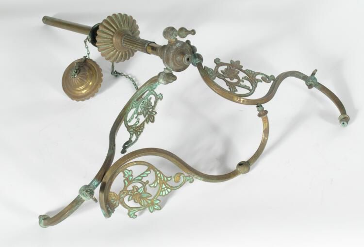 Eastlake/Aesthetic style bronze ceiling chandelier. Unusual flat-pattern armbacks. Shades: Unknown Fuel: Gas Finish: Aged