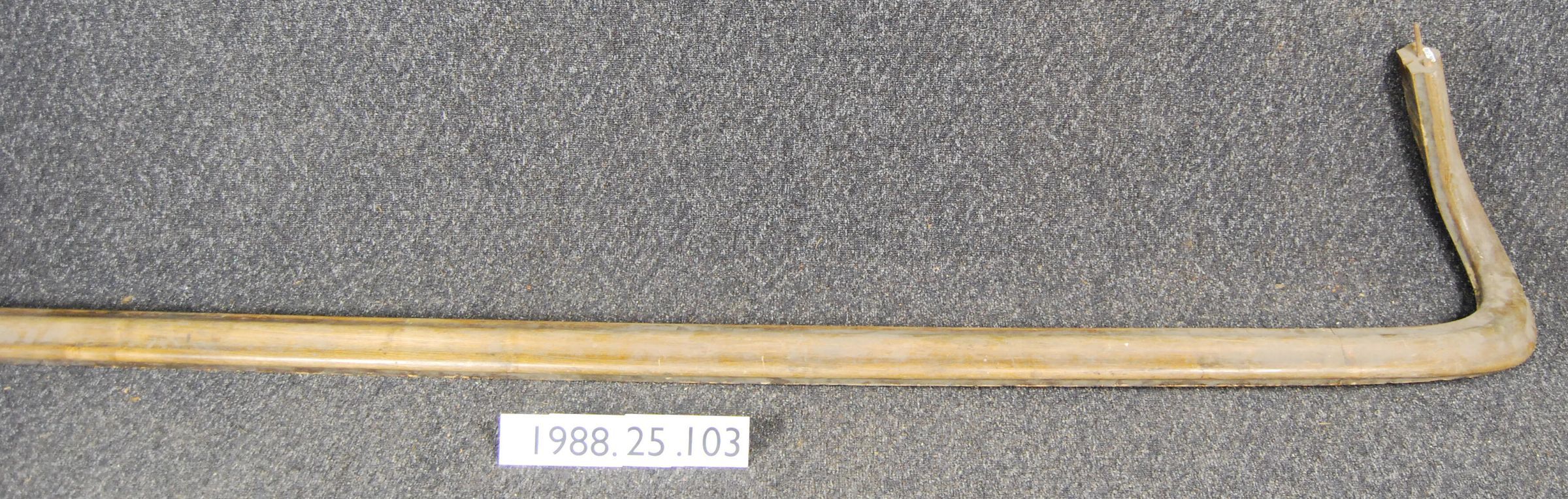 Stair handrail. Compound molding profile. Curved and twisted return at one end. Opposite end has part for mounting newel post cap. Made of ash wood. Varnished.