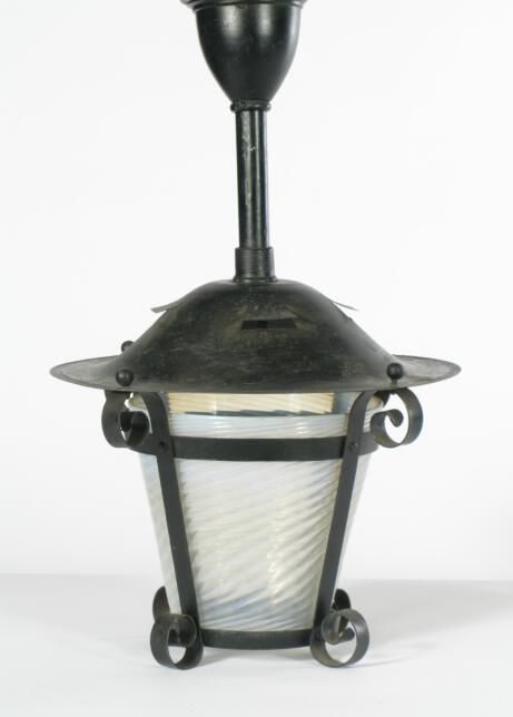 Artistic style wrought iron ceiling pendant. Possibly refinished at some point.