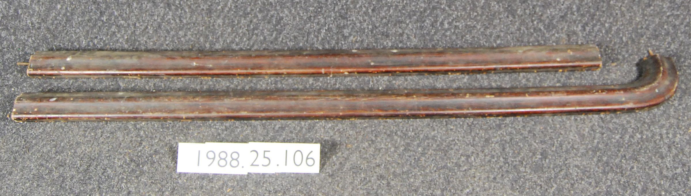 One lot of two stair handrails. Compound molding profile. One section has J-shaped return with iron belt. Other rail has attached lag bolt. Made of ash wood. Varnished.
