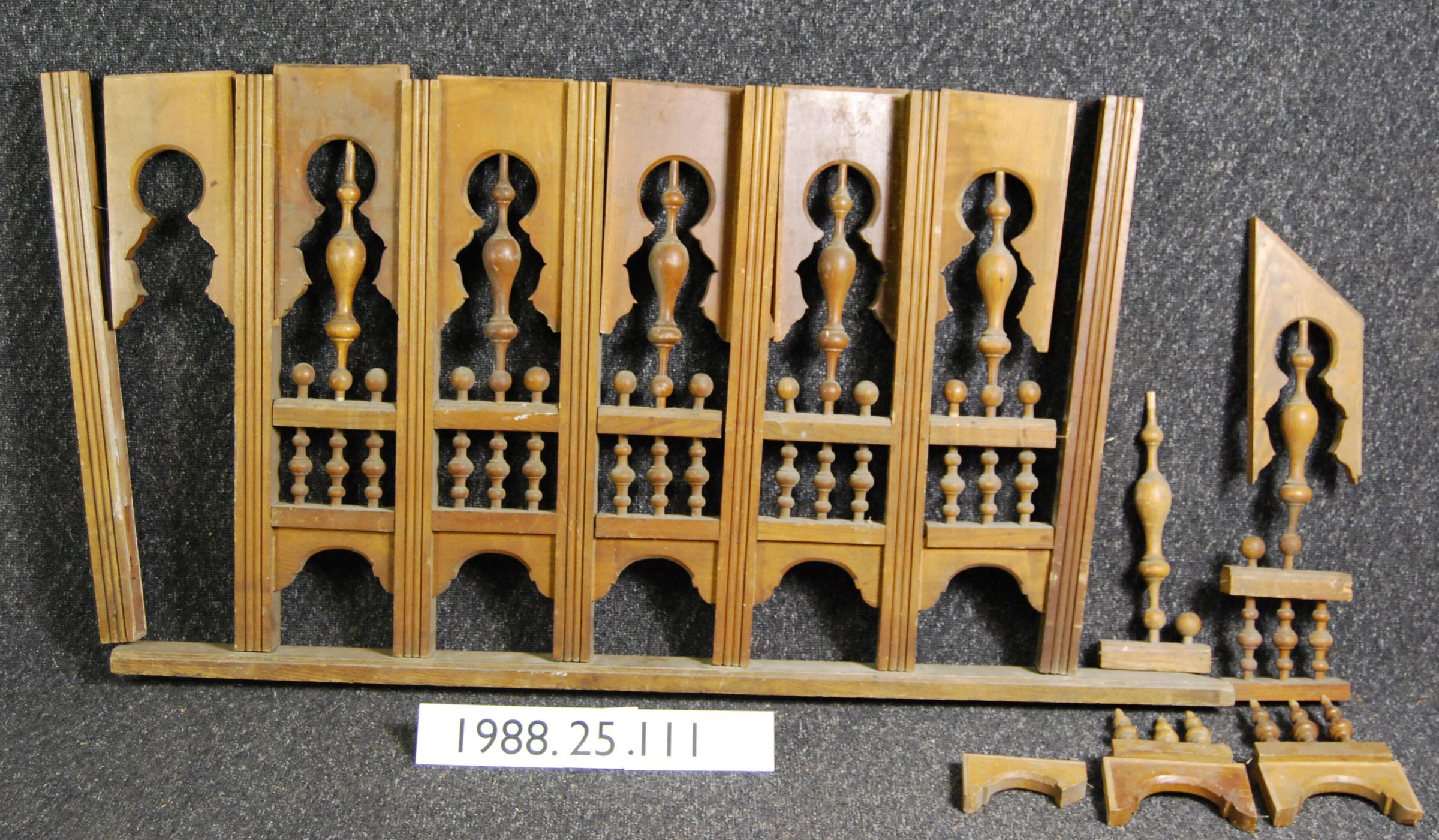 Balustrade. Composed of Series of seven balusters. Fret-cut ornaments. Elaborate spindle work. Includes numerous detached parts. Made of ash wood. Varnished.