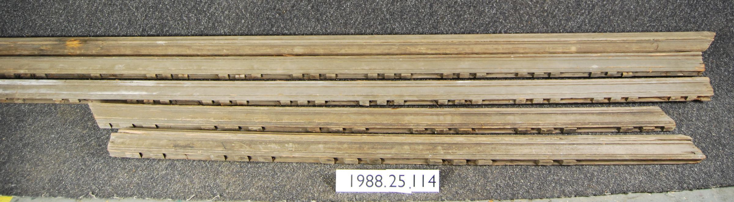 One lot of five stair handrails. Compound molding profile. Made of softwood. No finish. Weathered surface.