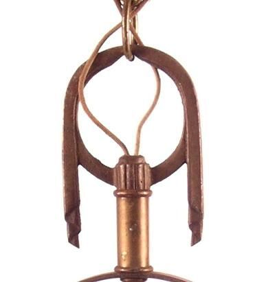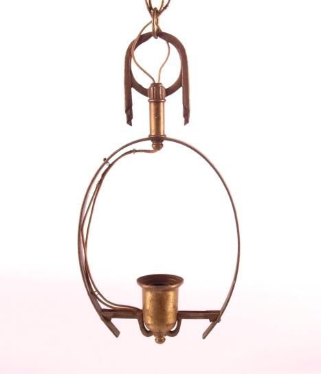 Art Deco style steel ceiling fixture. Curtain fold casting; strap steel loop. Shades: None Fuel: Electric Finish: Brushed brass plate