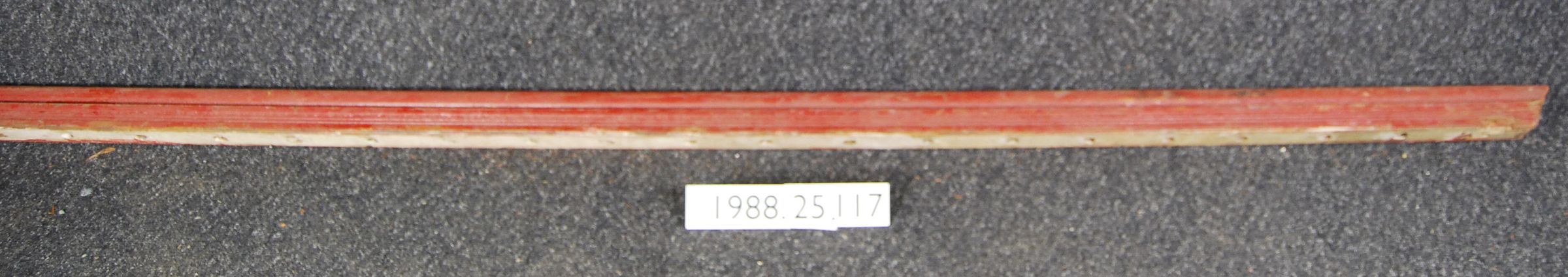 Stair handrail. Compound molding profile. Made of softwood. Painted red / white.