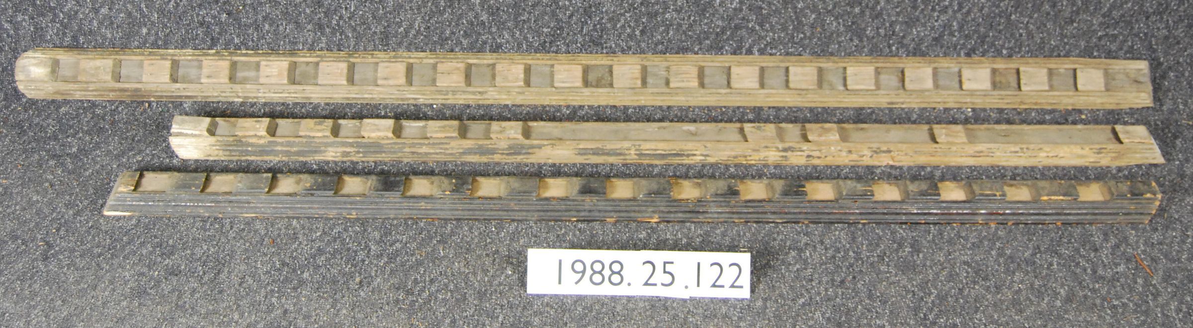 One lot of three stair handrails. Compound molding profile. Made of softwood. Varnished.