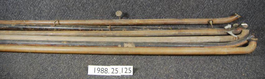 One lot of six stair handrails. Has series of mounting hardware components. Cylindrical with each end curved. Two handrails have later hardware component added. Made of ash wood. Varnished.