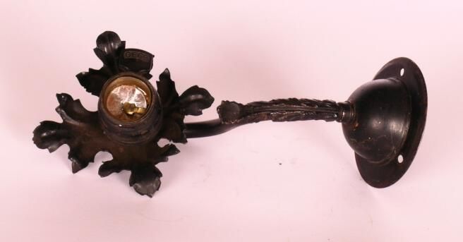 Brass wall bracket. Floral husk; G.E. Co. key Shades: Unknown Fuel: Electric Finish: Black