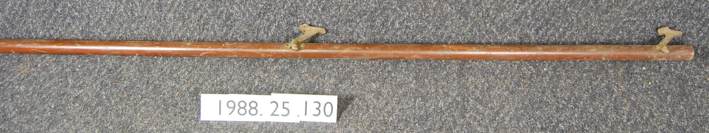 Stair handrail. Cylindrical. Iron brackets (four) with "TICE" trademark. Made of softwood - possibly Douglas fir. Varnished.
