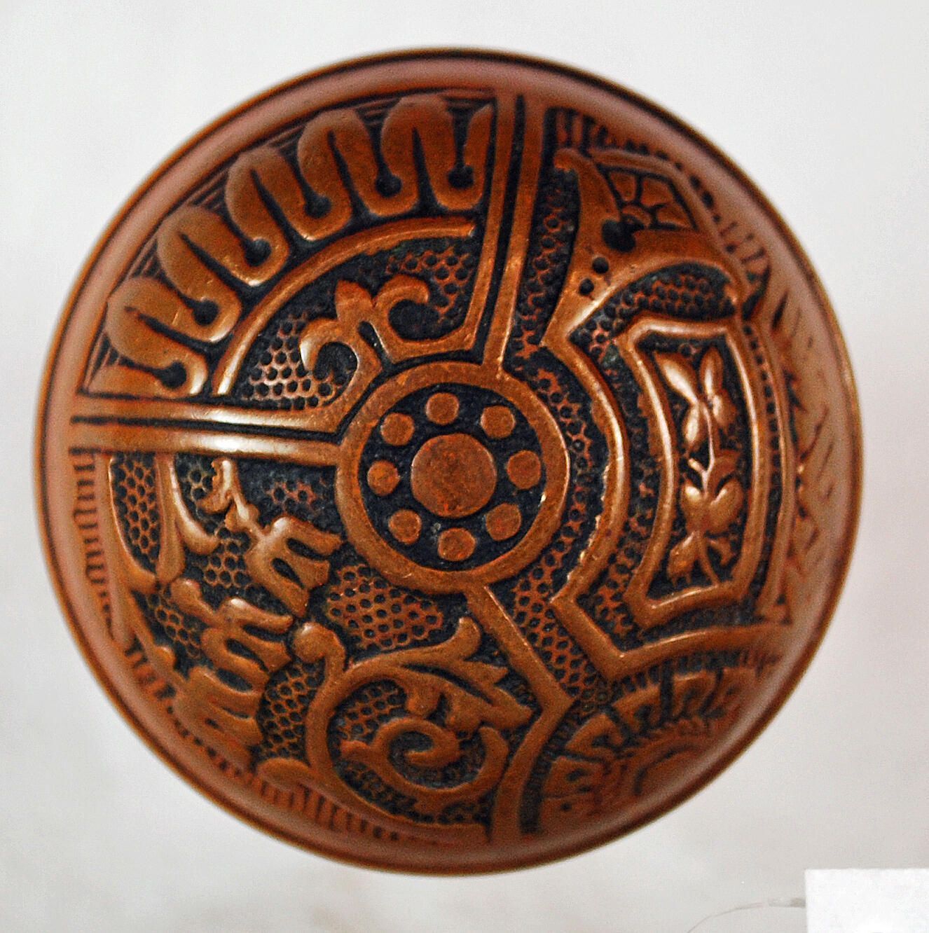 3 part stamped brass doorknob. Surface Texture: Unpolished Surface Color/Finish: Relieved/Black Ornament: Stamped Remarks: Design Name: Ceylon School: Eastlake VDA Classification: Group & No: B114 Comment: Company Name: Corbin Date: 1895 Material: Brass Manufacturing Method: Stamped