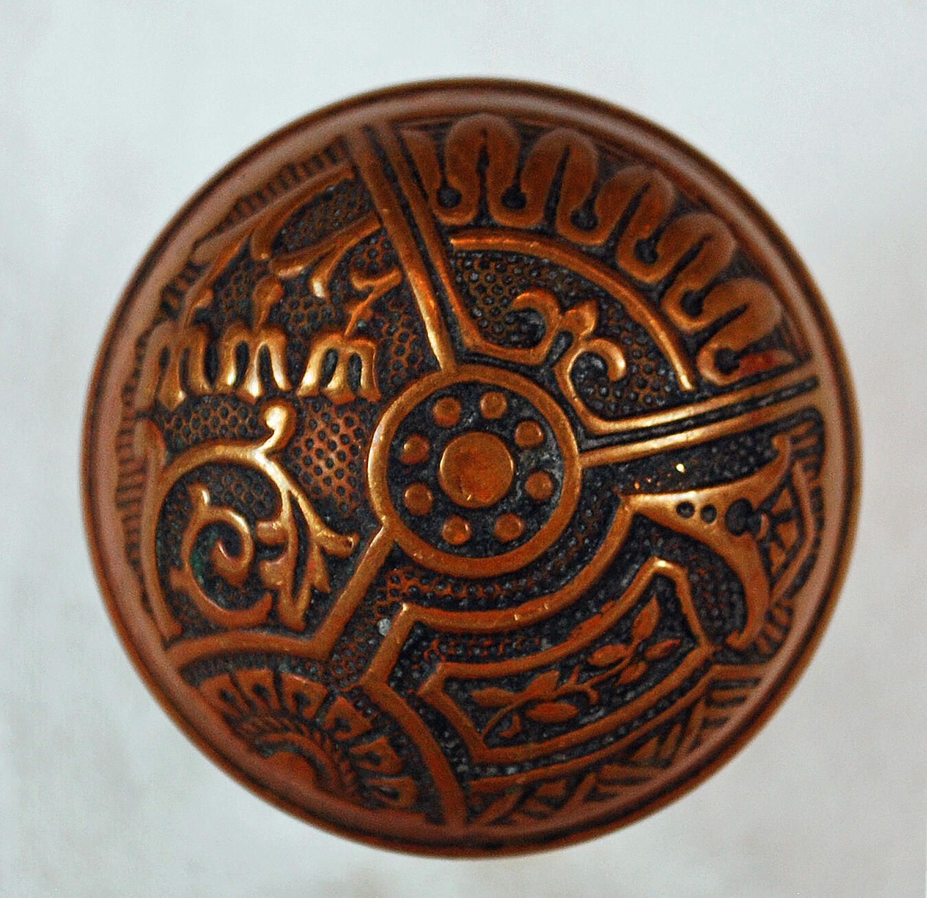 3 part stamped brass doorknob. Surface Texture: Unpolished Surface Color/Finish: Relieved/Black Ornament: Stamped Remarks: Design Name: Ceylon School: Eastlake VDA Classification: Group & No: B114 Comment: Company Name: Corbin Date: 1895 Material: Brass Manufacturing Method: Stamped