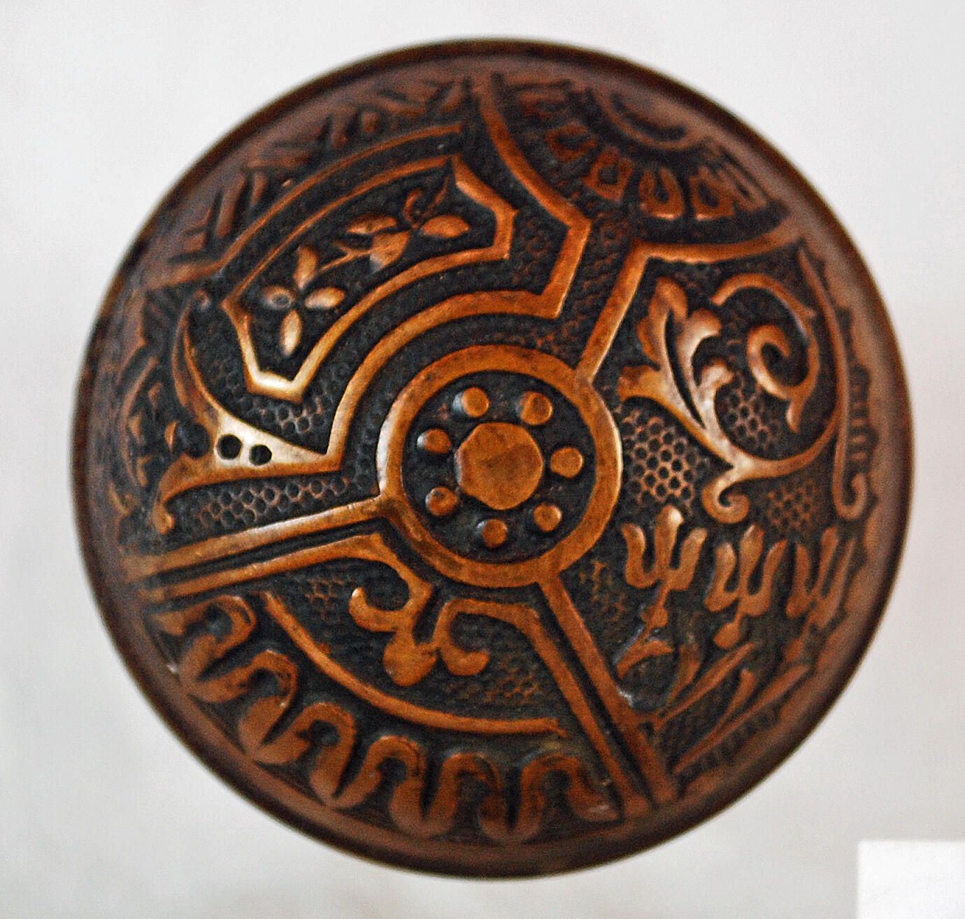 3 part stamped brass doorknob. Surface Texture: Unpolished Surface Color/Finish: Relieved/Black Ornament: Stamped Remarks: Design Name: Ceylon School: Eastlake VDA Classification: Group & No: B114 Comment: Company Name: Corbin Date: 1895 Material: Brass Manufacturing Method: Stamped