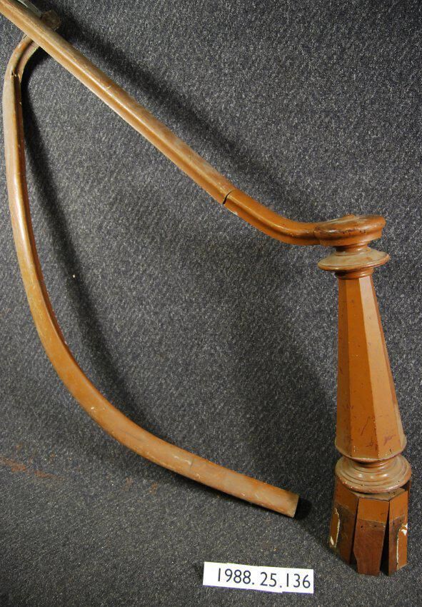 Newel post. Octagonal sides. Turned components. Has newel post cap made of mahogany. Two detached mahogany handrails, one of which is curved and twisted. Secondary wood in newel post is cedar. Portions of the base are disassembled. Veneered. Originally varnished - now painted brown / white.