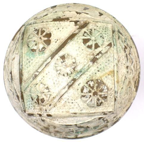 Construction: 3 part stamped Surface Texture: Surface Color/Finish: Ornament: Design Name: School: Vernacular Remarks: Back side of ball ornamentation VDA Classification: Group & No: H-219A Comment: Catalog : Company Name: F.C. Linde Date: 1885 Material: Brass Manufacturing Method: Stamped