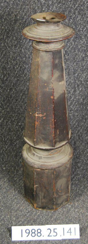 Newel post. Cap is missing. Has turned components. Octagonal tapered built-up post and octagonal base. Made of ash wood with secondary wood of cedar. Has veneered sides. Varnished.