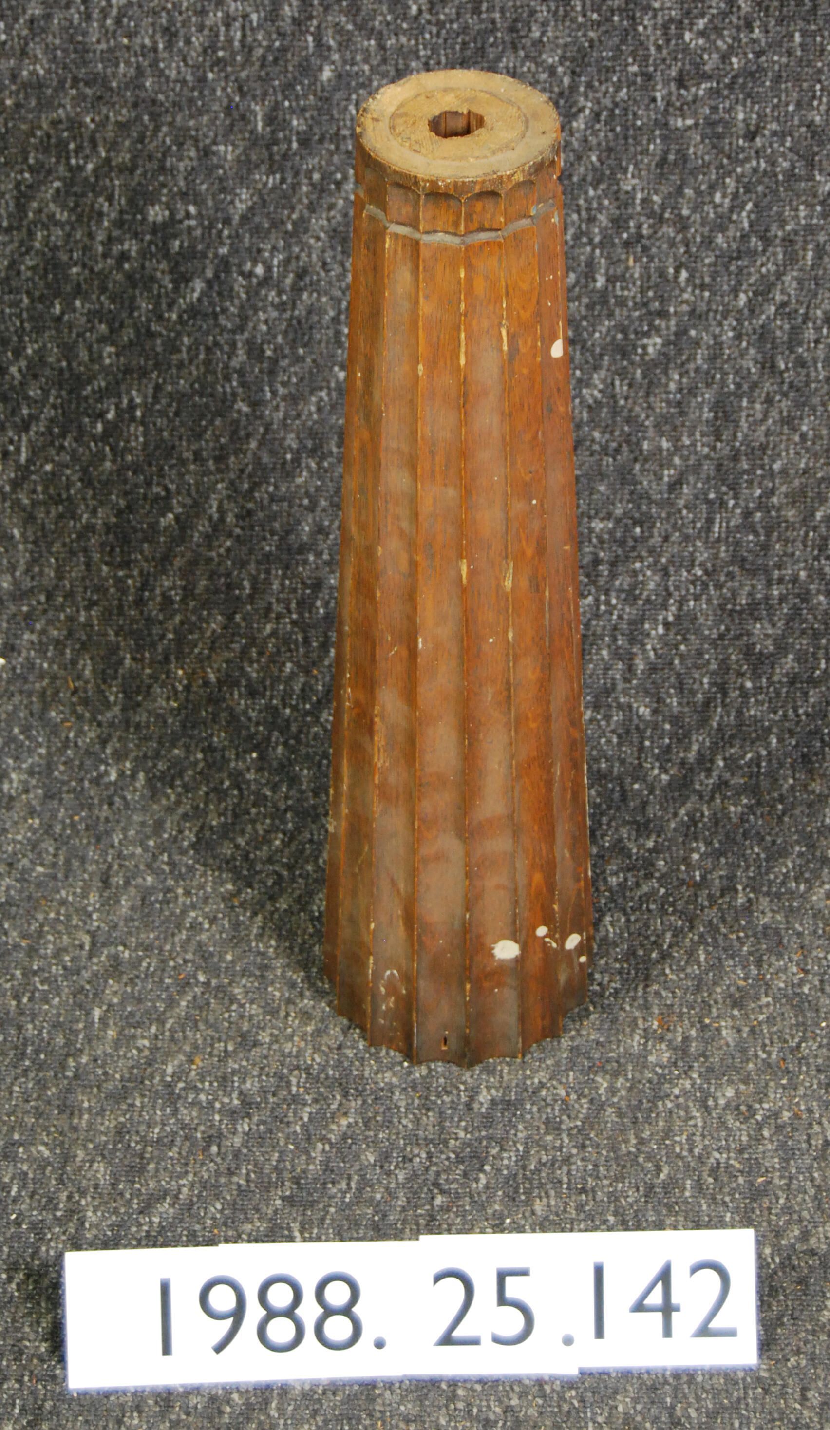 Fluted, tapered, built-up post. Hardwood on outside, secondary wood is cedar. Varnished.