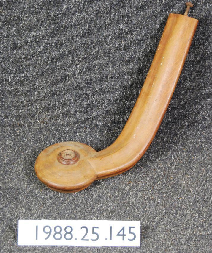 Curved mahogany stair rail with attached newel post cap. Has iron bolt and nut at one end. Varnished.