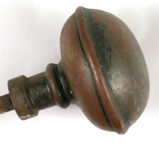 Construction: 3 part stamped knob; cast shank Surface Texture: Bower-barffed Surface Color/Finish: Japanned Ornament: Plain with bead Design Name: School: Remarks: VDA Classification: Group & No: Comment: Catalog : Company Name: Date: Material: Brass Manufacturing Method: