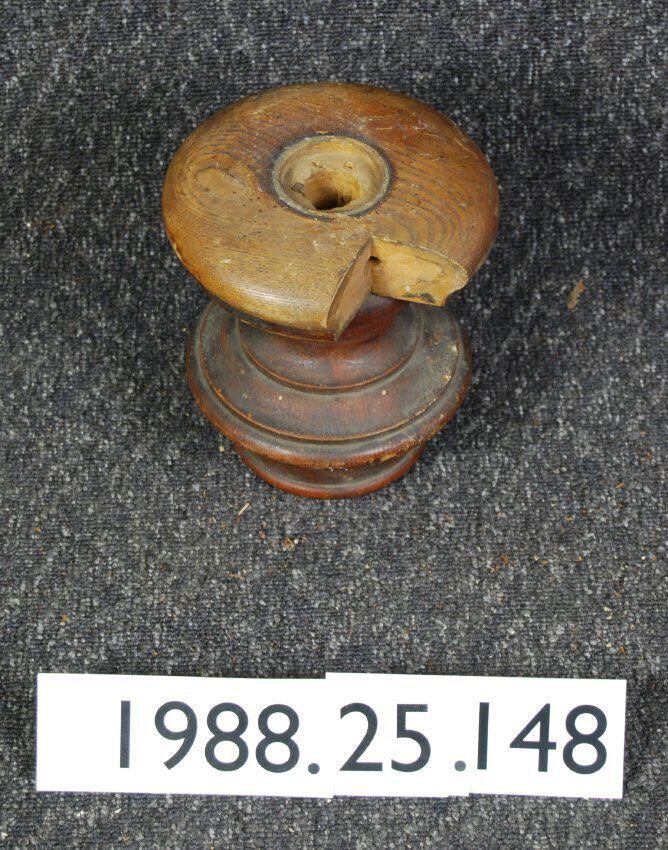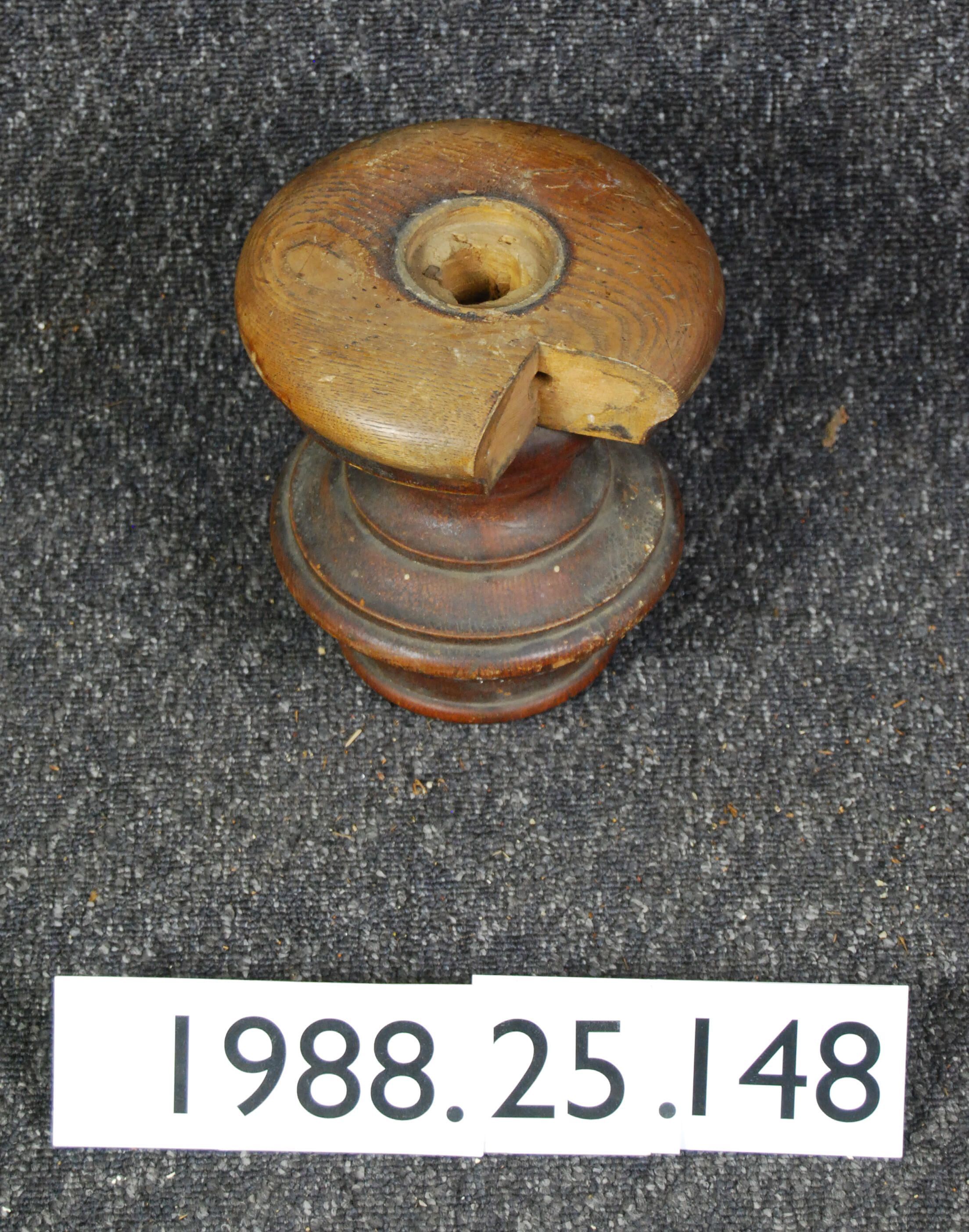 Turned stair newel post top. Lower end is truncated. Has circular cap made of ash wood. Varnished.