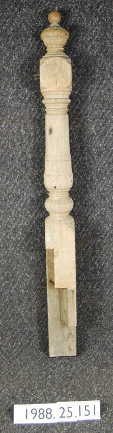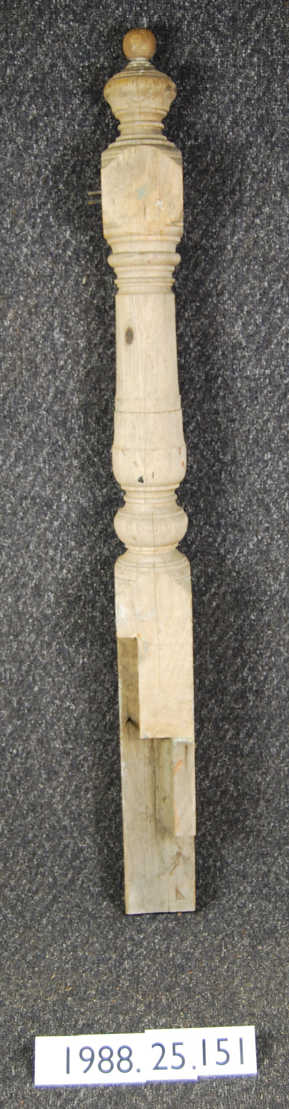 Turned stair newel. Solid shaft with bulbous finial, below which is square section, below which is turned section, below which is square section notched to fit stairs. Made of ash wood. Originally varnished, later painted and partially stripped.