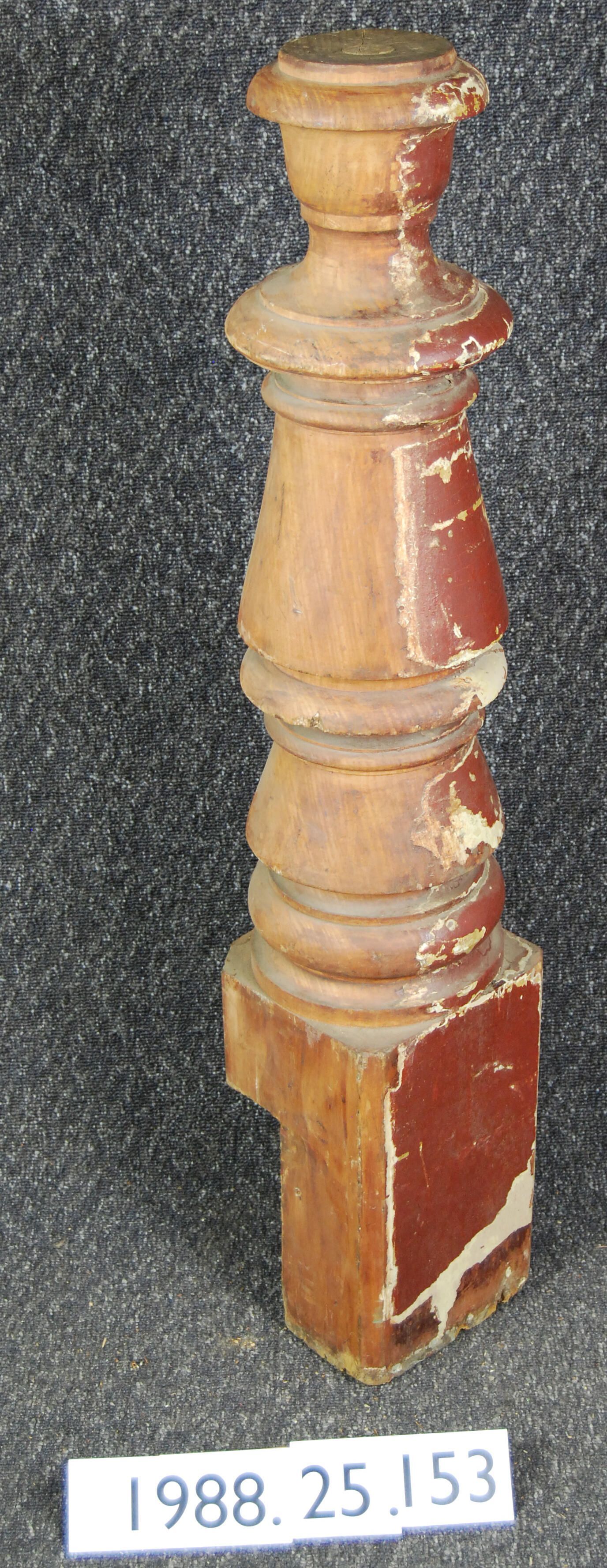 Turned stair newel. Solid shaft with complex contour. Made from solid timber (possibly maple?). Hardwood bottom end square in section. Notched at one corner. Originally varnished - later painted cream / reddish-brown - partially stripped.
