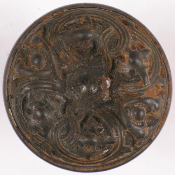 Construction: Stamped Surface Texture: Black paint Surface Color/Finish: Paint/steel Ornament: Stamped Design Name: School: Art Nouveau Remarks: 6 fold symmetry, sort of 8 nubs on back of knob (for better grip) VDA Classification: Group & No: Comment: Catalog : Company Name: Date: Material: Steel Manufacturing Method: Stamped; cast shank