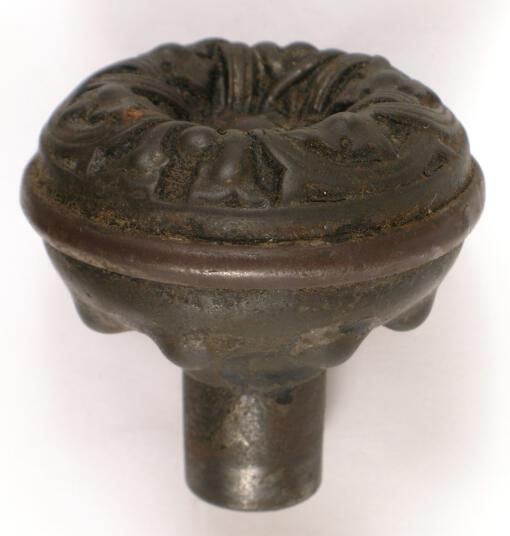 Construction: Stamped Surface Texture: Black paint / worn steel Surface Color/Finish: Paint/steel Ornament: Stamped Design Name: School: Art Nouveau Remarks: 6 fold symmetry, sort of 8 nubs on back of knob (for better grip) VDA Classification: Group & No: Comment: Catalog : Company Name: Date: Material: Steel Manufacturing Method: Stamped; cast shank