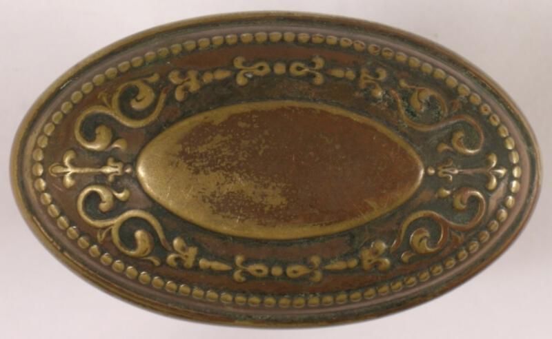 Construction: Stamped Surface Texture: Unpolished Surface Color/Finish: Brass highlights; copper in low spots Ornament: Design Name: Alden School: Adam Remarks: VDA Classification: Group & No: N 114 Comment: More leaf detail Catalog : Company Name: Date: Material: Brass Manufacturing Method: