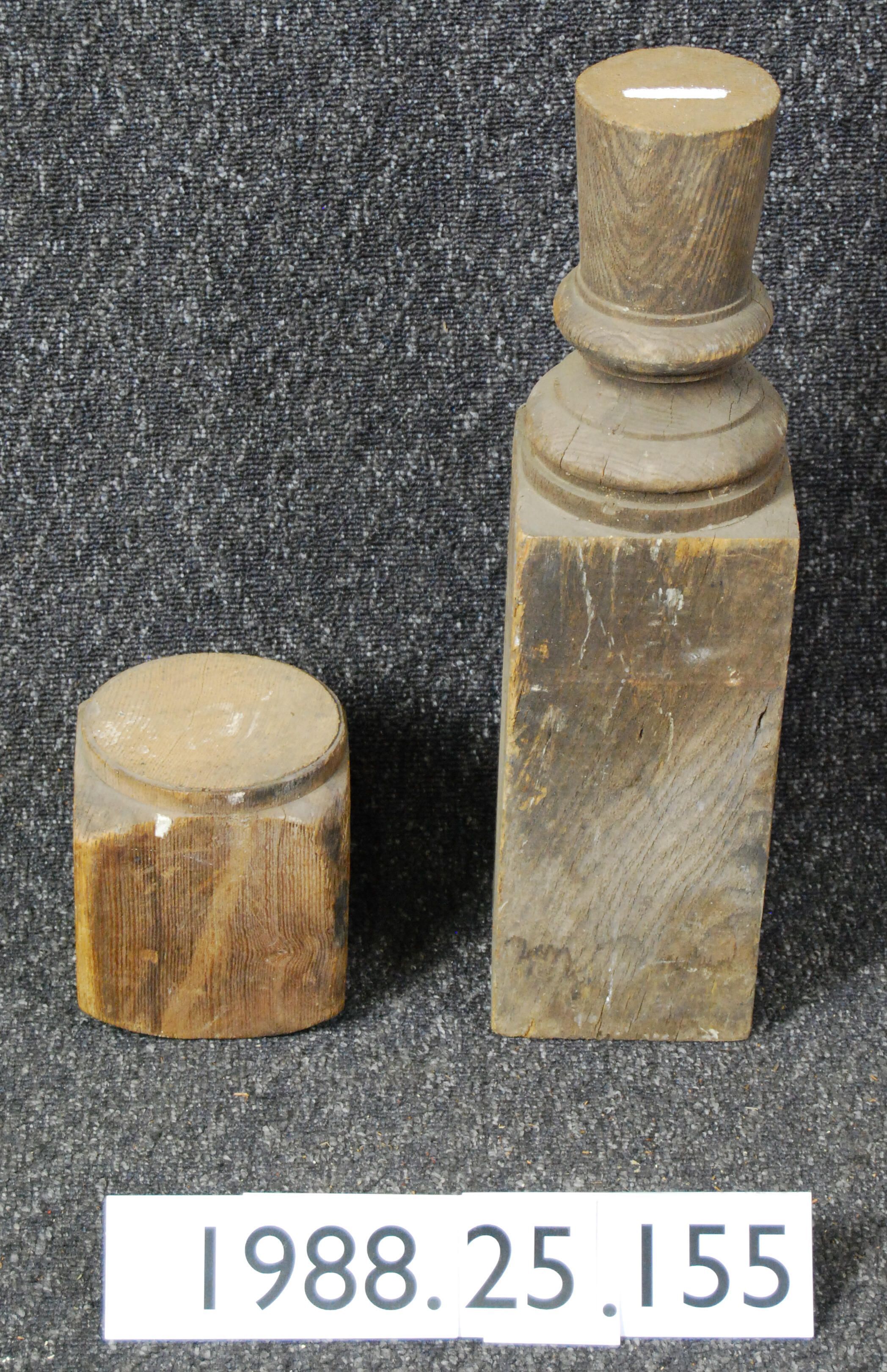 Turned stair newel post. Modified by being cut into two sections. Middle section missing. One section has square base. Made of ash wood. Has no finish.