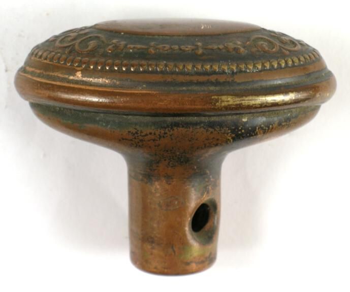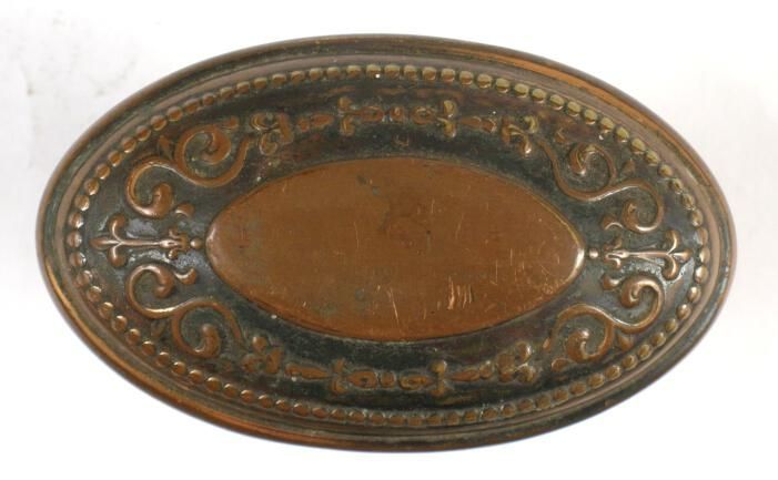 Construction: Stamped Surface Texture: Unpolished Surface Color/Finish: Brass, some copper Ornament: Stamped relief Design Name: Alden School: Adam Remarks: VDA Classification: Group & No: N 114 Comment: More leaf detail Catalog : Company Name: Date: Material: Brass Manufacturing Method: