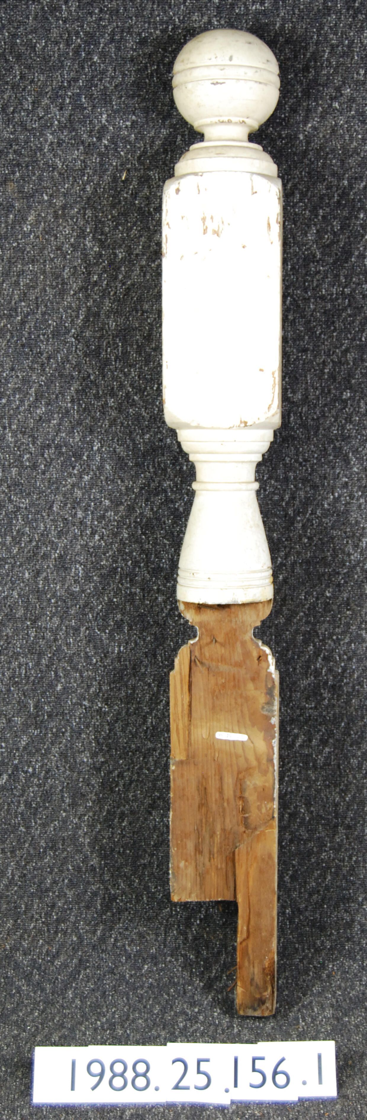 Turned stair newel post. with ball finial, below which is square section, below which is complex contour, below which is square base (notched). Made of softwood. Originally varnished - now painted white.