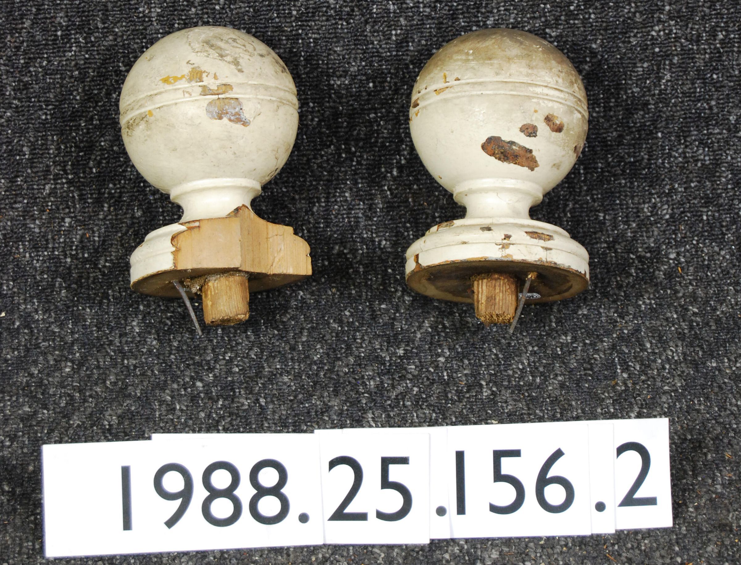 One lot of Two turned (stair?) ball-shaped finials which match pattern on newel posts. Made of softwood. Originally varnished - now painted white.