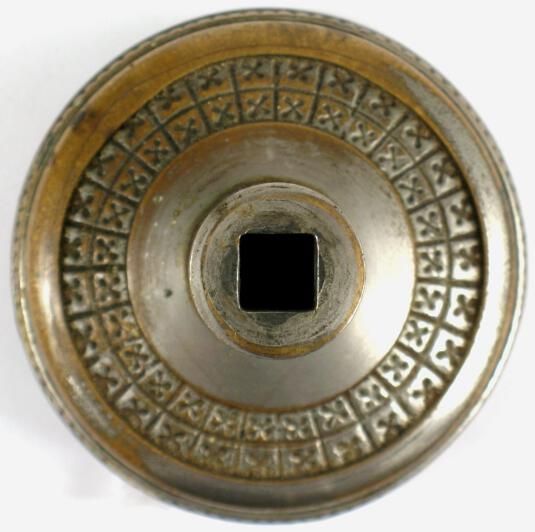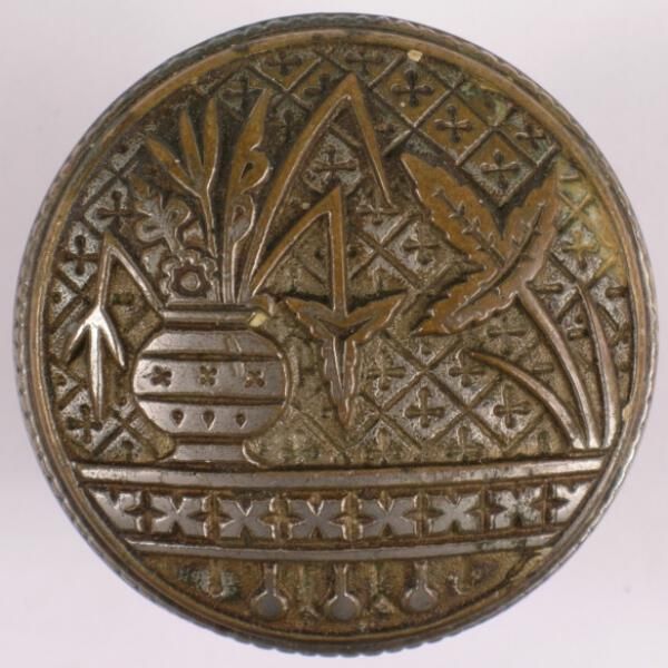 Construction: 2 part wrought Surface Texture: Surface Color/Finish: Ornament: Design Name: Broken Leaf School: Vernacular Remarks: Pattern on back VDA Classification: Group & No: B 125 Comment: Catalog : Company Name: Lockwood Date: May 22, 1887 Material: Bronze Manufacturing Method: