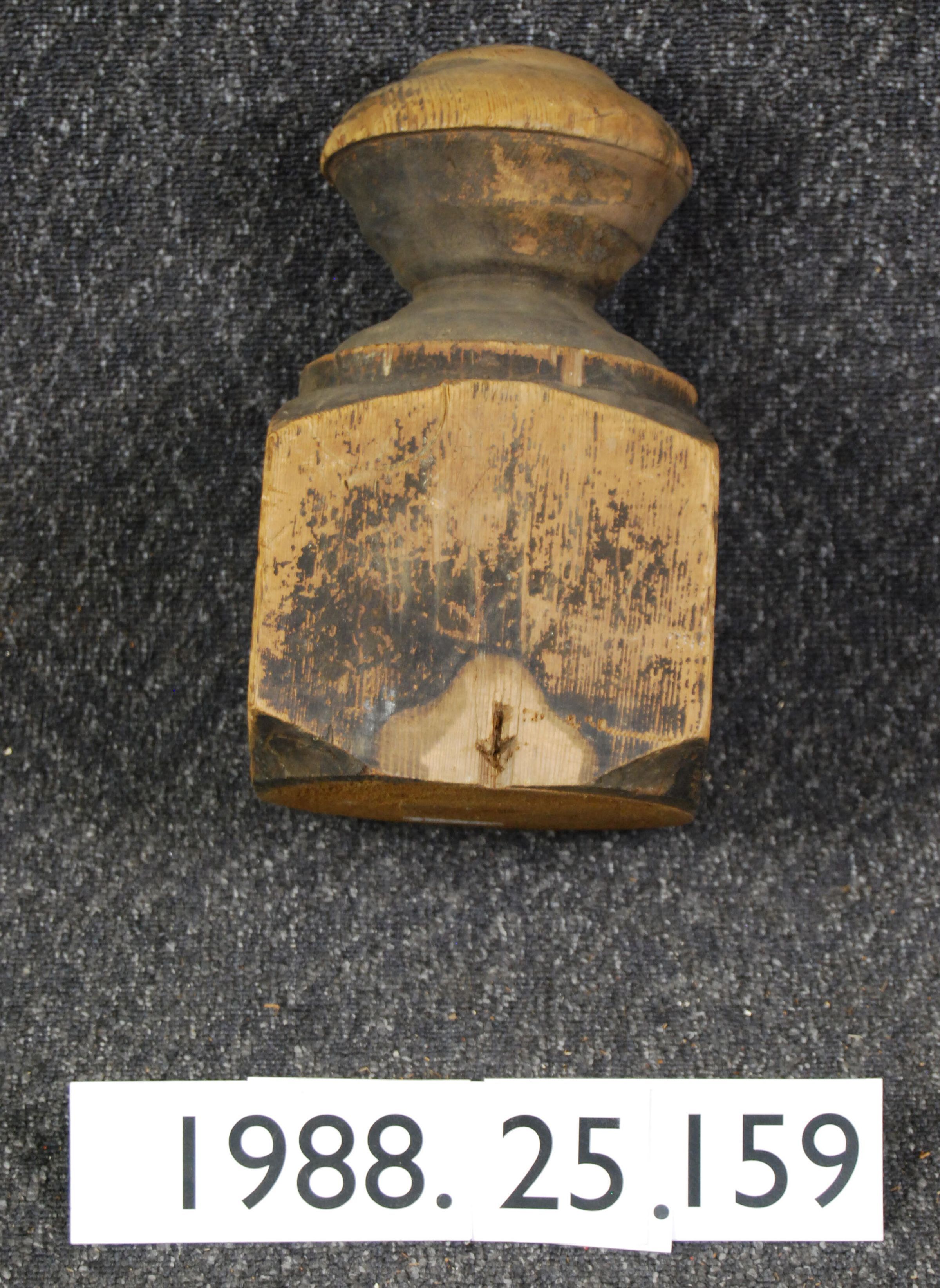 Turned stair newel post top with bulbous finial, below which is square section, below which is truncated. Made of softwood with remnants of varnish.
