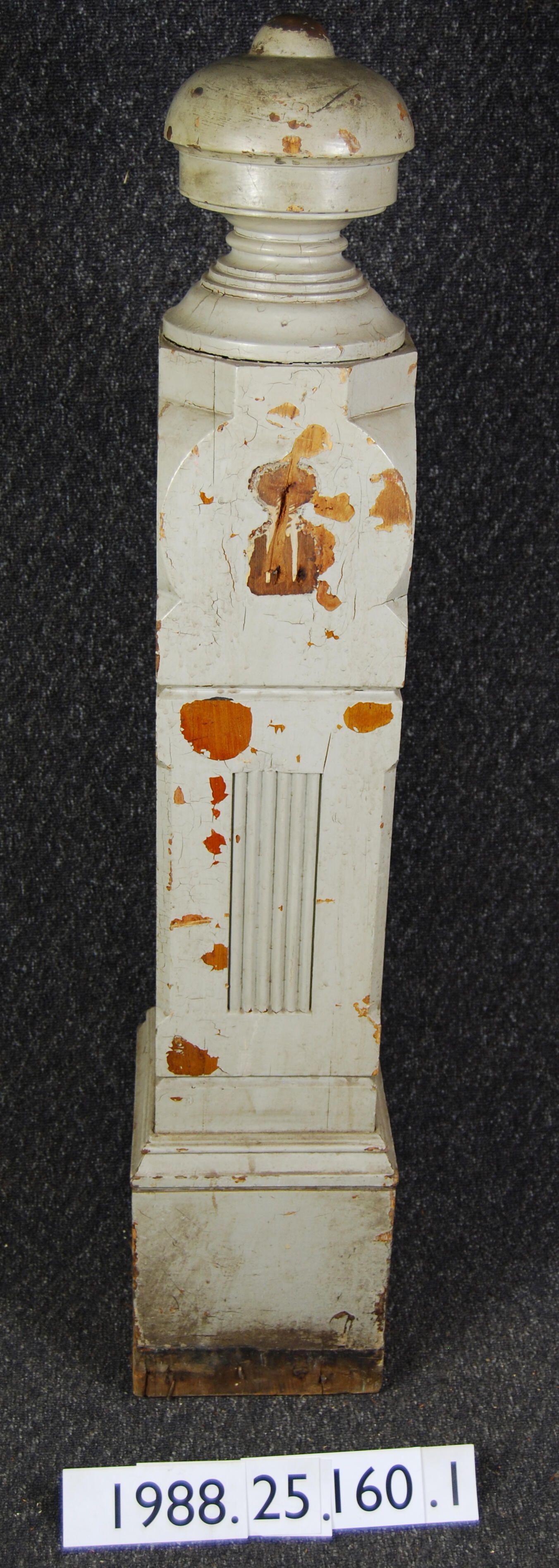 Square built-up stair newel post with bulbous finial. Beaded panel on four sides. Stop chamfered corners, square base. Made of ash wood. Originally varnished - now painted grey.
