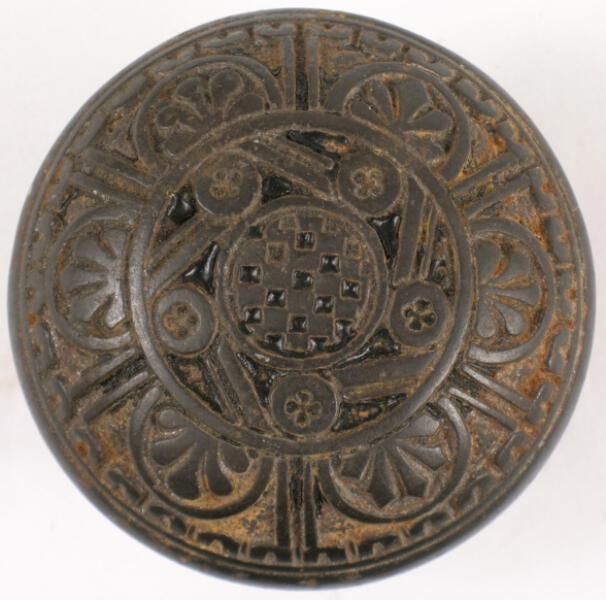 Construction: 2 part wrought iron Surface Texture: Surface Color/Finish: Ornament: Design Name: School: Vernacular Remarks: Sixfold symmetry on outer ring; fivefold on inner ring; Norwich pattern on back. VDA Classification: Group & No: Comment: Resembles VDA J 211 Catalog : Company Name: Date: Material: Iron Manufacturing Method: