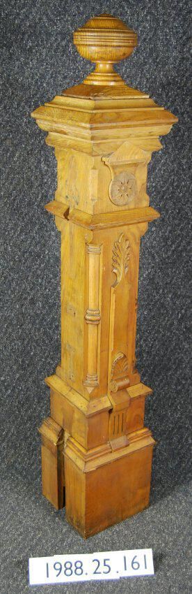 Square built-up stair newel post with bulbous finial. Elaborate applied ornamentation including botanical motif rosettes. Carved ornaments with botanical motifs. Moldings made of ash wood. Varnished.