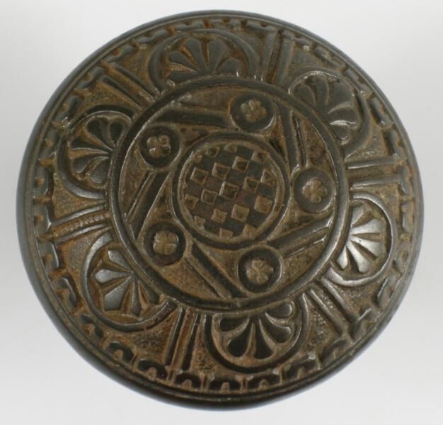 Construction: 2 part Surface Texture: Surface Color/Finish: Natural Ornament: Design Name: School: Vernacular Remarks: VDA Classification: Group & No: J 211 Comment: Similar knob Catalog : Company Name: Norwich Date: 1883 & 1892 Material: Bronzed Iron? Manufacturing Method: Cast