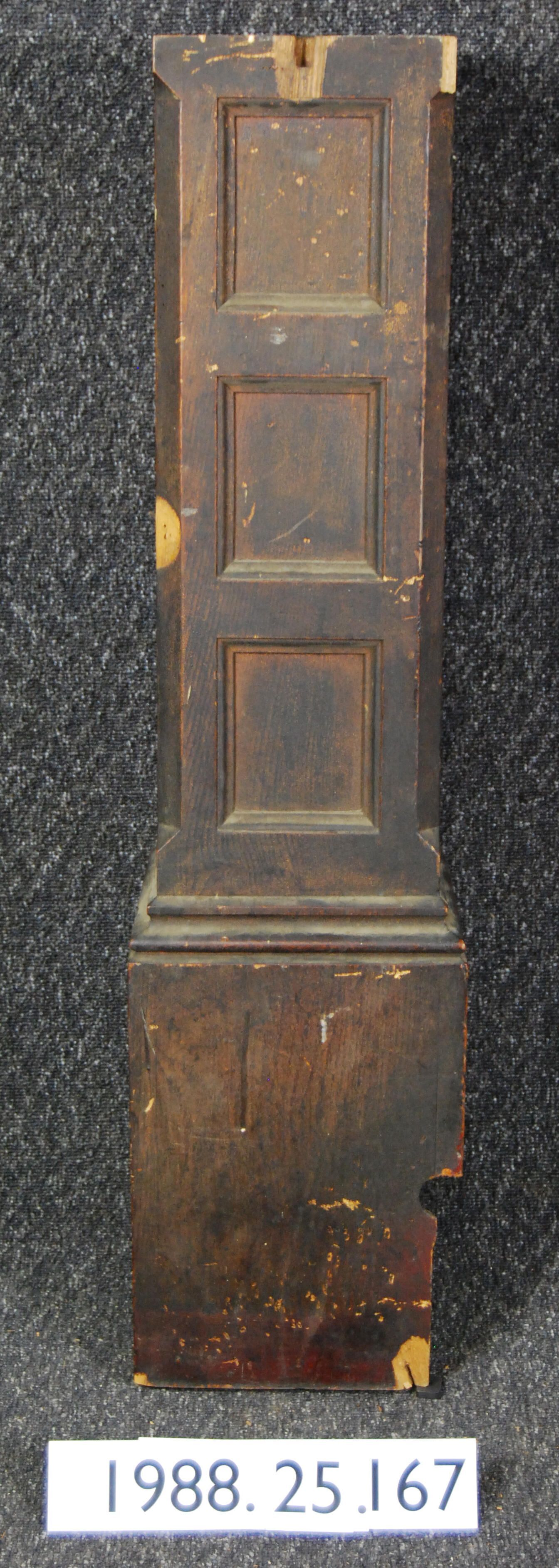 Square built-up stair newel post . Top is missing. Has panelled sides. Made of ash wood. Varnished finish.
