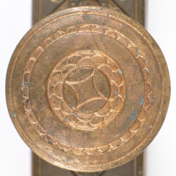 Construction: 1 part Surface Texture: Surface Color/Finish: Natural Ornament: Design Name: School: Remarks: Center abstract "flower" design surrounded by concentric bands, scallops & line. Plate has complimentary design. VDA Classification: Group & No: Comment: Catalog : Company Name: Date: Material: Bronze Manufacturing Method: Cast?