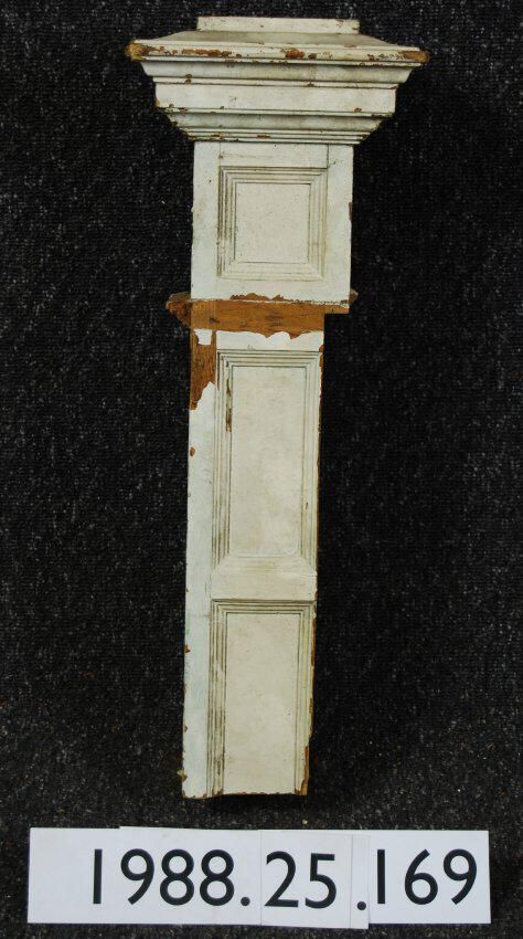 Square built-up stair newel post with applied moldings, panelled sides. Side and bottom are missing. Made of ash wood. Originally varnished - now painted white.