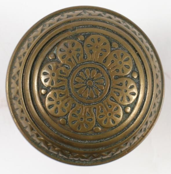 Construction: Stamped brass Surface Texture: Surface Color/Finish: Ornament: Design Name: School: Remarks: Design has a stenciled quality. Lockwood purchased Nashua designs in 1891. VDA Classification: Group & No: K 201 Comment: Catalog : Company Name: Nashua Lock Co. Date: 1884 Material: Brass Manufacturing Method: Wrought stamped brass
