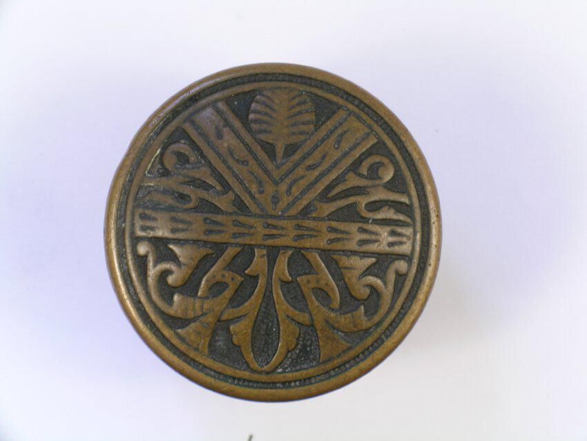 Construction: Cast / bronze Surface Texture: Unpolished Surface Color/Finish: Natural / relieved Ornament: Assymetrical Design Name: Egyptian School: Eastlake Remarks: VDA Classification: Group & No: B 121 Comment: Catalog : Company Name: Branford Date: 1885 Material: Bronze Manufacturing Method: Cast/Bronze