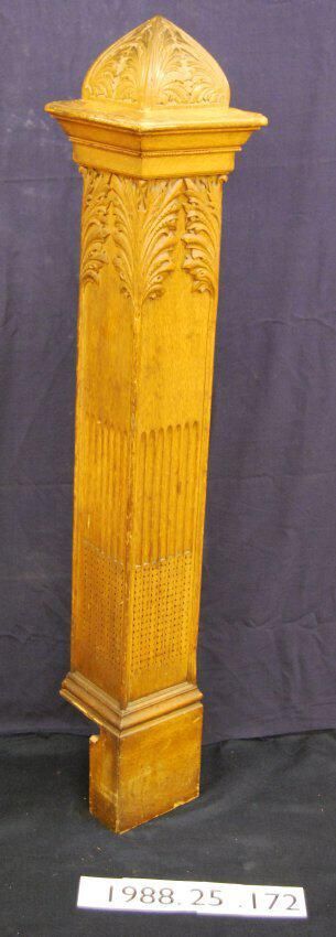 Square built-up newel post. Has iron bolt for attachment of lower rails. Elaborate carved leaf motifs on all four sides. Pointed top with curved sides converging to point. Has applied moldings near top and bottom. Has panels with fluting, repeating button-shaped infill ornaments and notch for upper rail. Evidently a landing newel. Made of oak, with remnants of original finish. Secondary wood of cedar.
