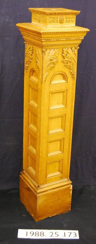 Square built-up stair newel post. Elaborate carved leaf motifs on all four sides. Separate newel post cap. Originally with light fixture (light fixture missing). Cap has egg-and-dart molding. Carved ornaments, and carved initials "JB," on cartouche. Upper end has applied compound contour moldings, Includes rope motif. Bead and lozenge motif. Fine bead motif below lower end. Has applied moldings. Made of oak. Secondary cedar wood. Outside has varnished finish.