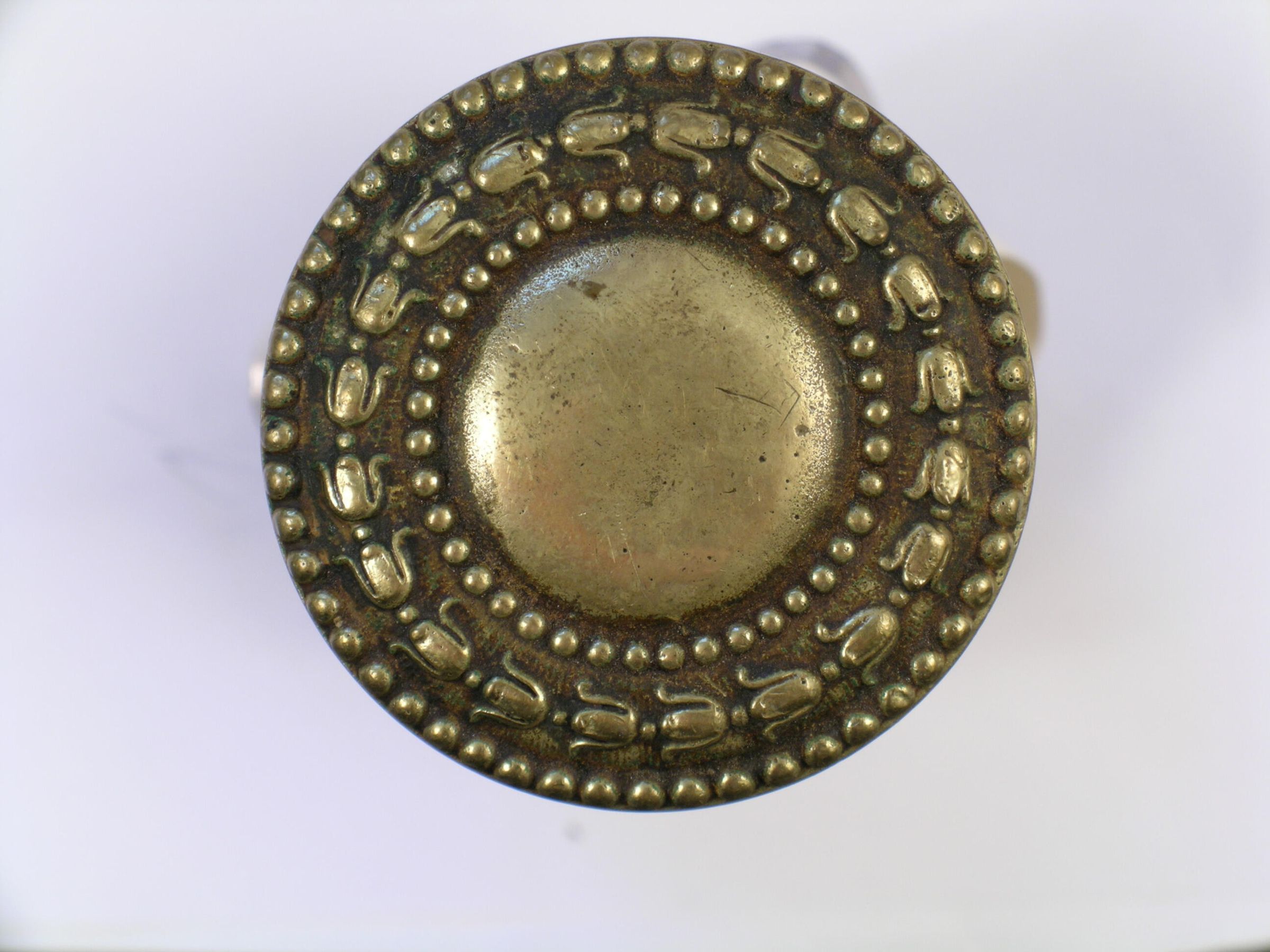 Construction: 3 part wrought Surface Texture: Unpolished Surface Color/Finish: Natural / relieved Ornament: Concentric symmetry Design Name: School: Colonial Remarks: VDA Classification: Group & No: Comment: Catalog : Company Name: Date: Material: Brass Manufacturing Method: Wrought