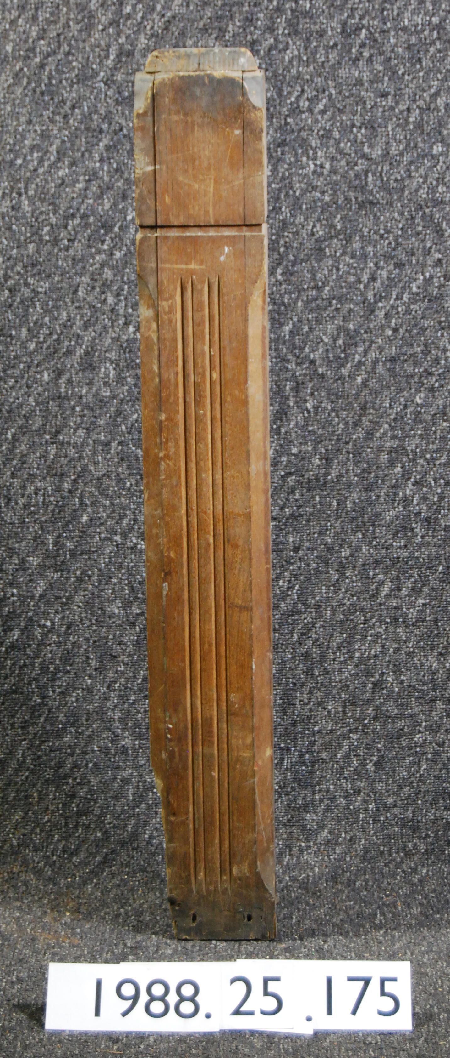 Square built-up stair newel post. Reeded ornament on all four sides. Stop chamfered corners. Ash wood. Varnished.