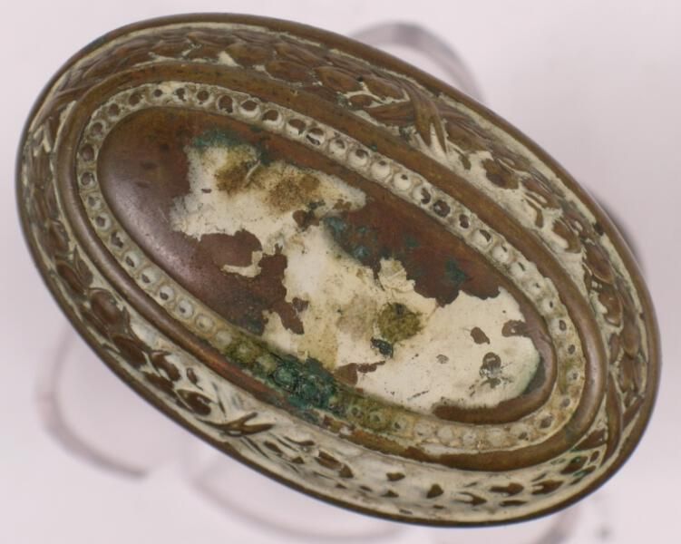 Construction: Surface Texture: Surface Color/Finish: Ornament: Design Name: School: Remarks: Oval VDA Classification: Group & No: Comment: Not listed in VDA Catalog : Company Name: Date: Material: Brass Manufacturing Method: Stamped