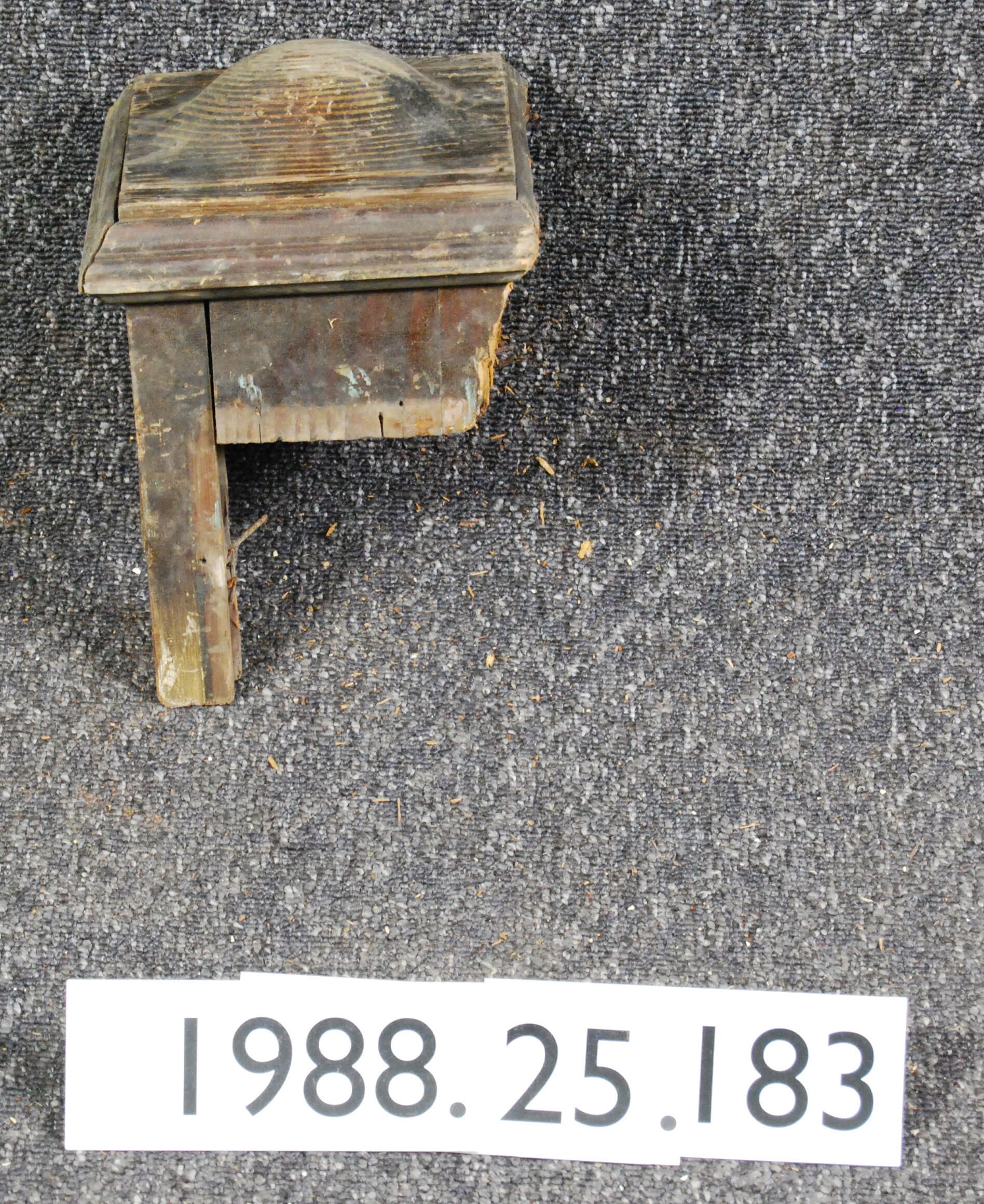 Square newel post cap. Includes fragmented sides of built-up post. One side decayed. Top of cap is convex. Made of soft wood. Varnished.